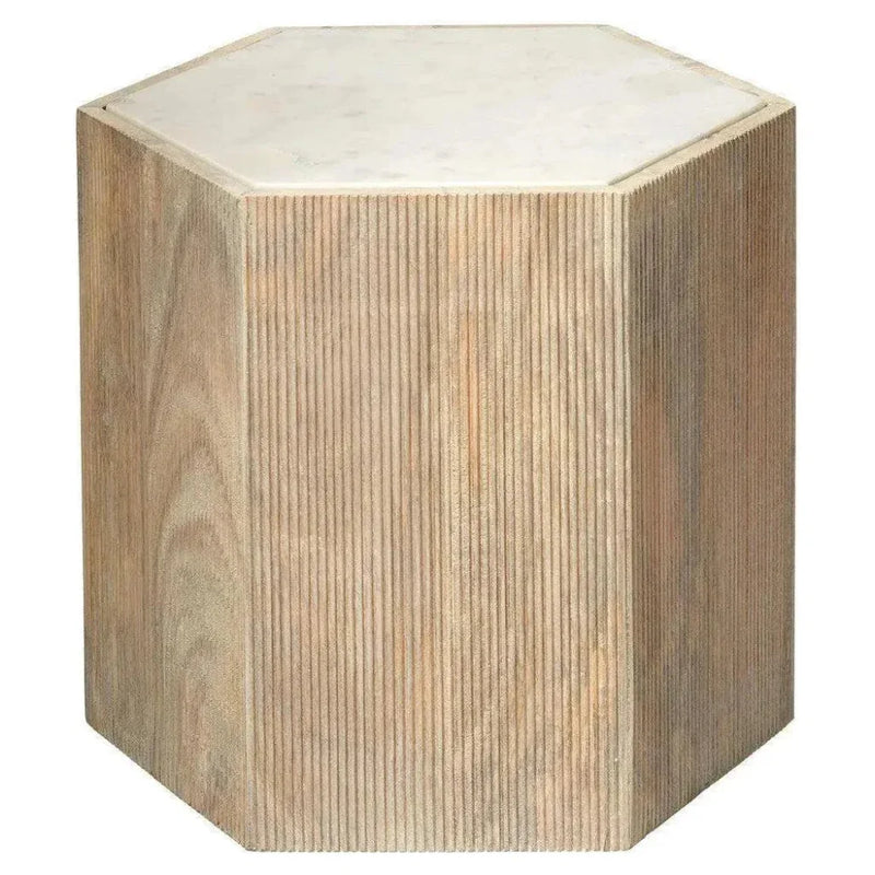The Hexagon Cream Marble Top Solid Wood End Tables Argan combine ribbed washed mango wood with natural white marble to bring timeless beauty and sophistication to your living room. Available in large, medium, and small sizes, each table features a spacious yet airy design that blends elegance with functionality. The marble tops showcase unique veining, colors, and patterns, while finishes vary, making every piece one-of-a-kind. Lightweight yet durable, these versatile side tables require minimal assembly and enhance any organic or transitional interior with their natural charm.