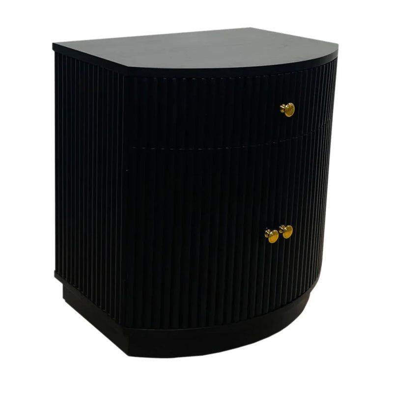 The Elle Side Table, effortlessly combines style and function. Crafted from sustainable Bayur wood and engineered Mindi wood, this piece highlights a commitment to quality and eco-friendly design. Its modern look is enhanced by a semi-circular cabinet featuring textured surfaces with vertical ridges, offering a touch of sophistication to any room. The table includes a drawer and a set of doors, providing ample storage space to keep your living area tidy and organized. The Elle Side Table is designed to fit seamlessly into a variety of home decor styles. Its compact dimensions allow it to fit comfortably in smaller spaces, making it a versatile addition to any home.