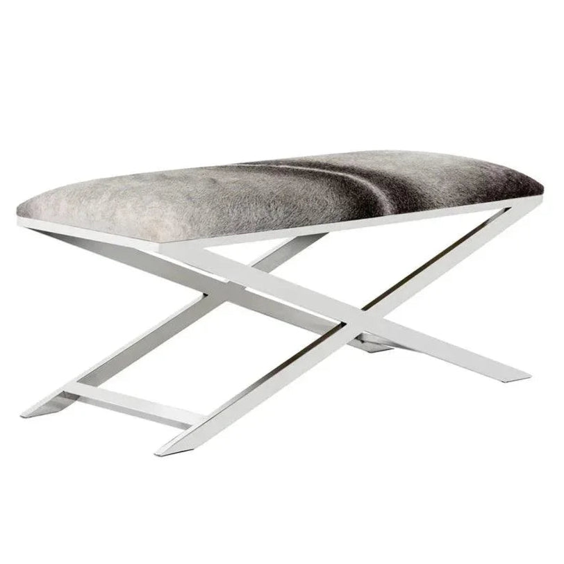 The Sahara bench is a true piece of art, crafted by skilled artisans. Each bench is unique, featuring a genuine cowhide seat in varying grey tones. This natural cowhide has organic markings and differences in hair length, color, and pattern, ensuring that no two benches are alike. The polished stainless steel x-base adds a modern touch, making it a stunning addition to any home or commercial space.