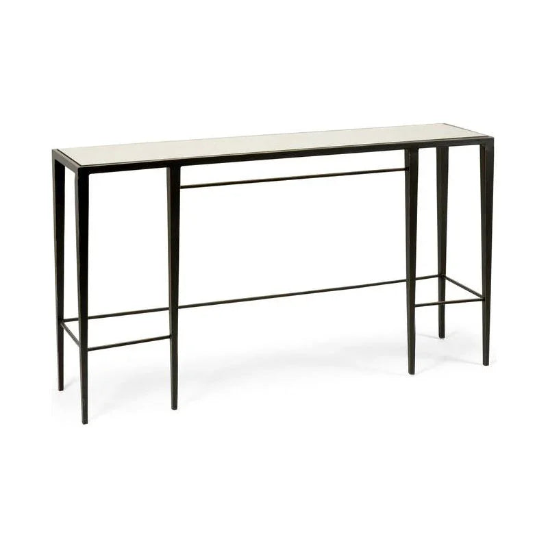 Perfectly suited for both contemporary and classic interiors, this console table adds a touch of elegance with its slender metal frame and minimalist design. The bronze finish on the iron frame gives it a timeless appeal, while the antique mirror top enhances its sophisticated look. This console table is part of the Wildwood collection, known for its quality and style. It is a versatile piece that can easily complement various home decor styles, making it an ideal choice for anyone looking to add a refined touch to their living space. With its rectangular design and tapered legs, this console table offers stability and style without taking up too much space.