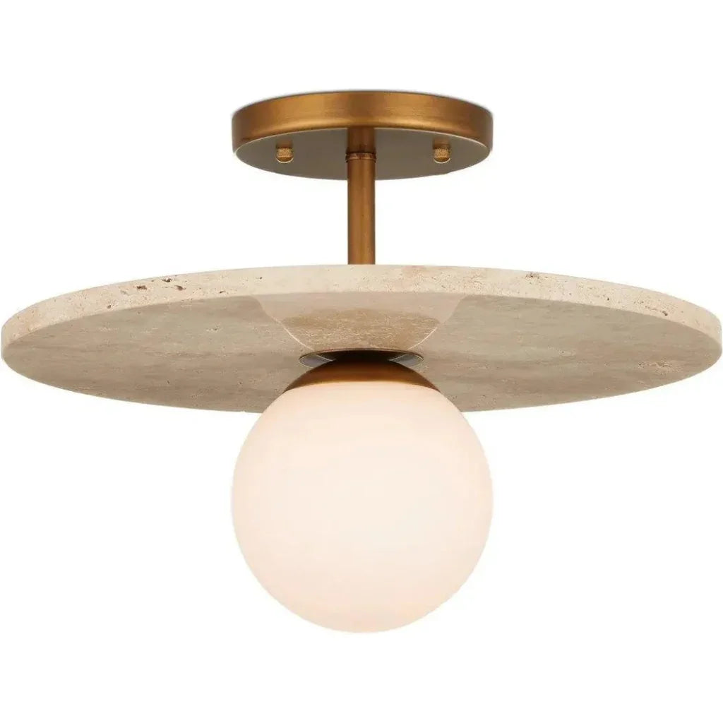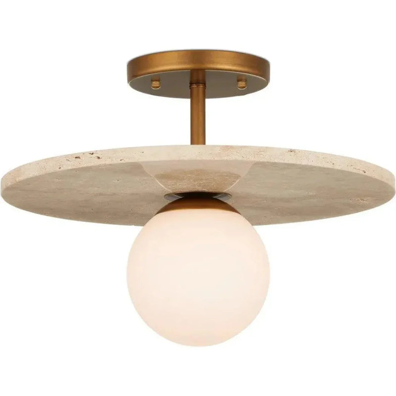 Inspired by a piece of jewelry, the Apricity Semi-Flush Mount features a frosted white cast-glass globe fitted to a travertine disc by metal hardware in an antique brass finish, reminiscent of a large pearl with its beautiful sheen. The simplicity of the profile leaves the glowing orb as the focal point of this design, while the way the illumination strikes the natural stone adds a clever aspect. The warmth of the metal draws out the subtle deeper tones in the travertine.