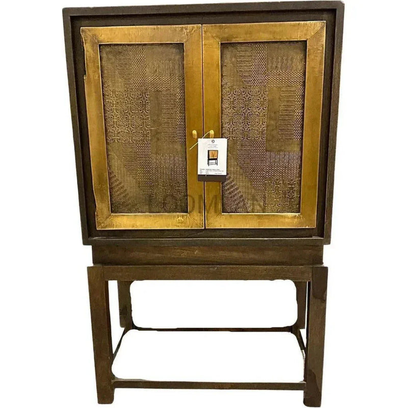 Transform your home bar with our meticulously handcrafted 60 x 36" Anvarra Mid Century Modern Liquor Cabinet. Crafted from the highest quality mango wood and embellished with luxurious gold doors, this cabinet seamlessly blends style and functionality. The solid wood doors are adorned with exquisite hand stamped brass sheeting, adding a touch of refinement. A timeless addition to any modern or mid-century themed home, our stunning handcrafted home bar wine cabinet from the Home Bar Collection offers a sophisticated twist on the classic design. Experience the ultimate union of style and utility with our meticulously designed handcrafted home bar wine cabinet.