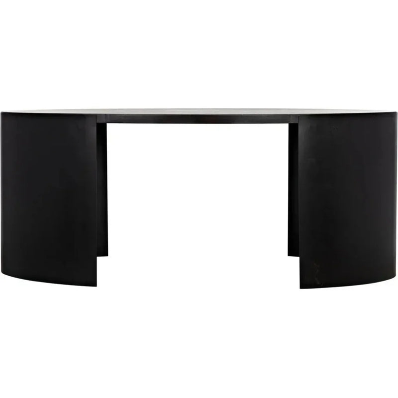 This Marigold Desk, with its Ebony Walnut and Black Metal accents, offers a unique oval silhouette that is sure to draw admiration. Its unique, oval silhouette, with its Ebony Walnut and Black Metal accents, adds a touch of timeless sophistication to any professional or formal space, creating a lasting impression. The warmth of walnut is paired here with the coolness of industrial steel. Complementary finishes pull the disparate materials together, with the desktop in Ebony Walnut, and the metal base in Matte Black. These artful design touches elevate the Marigold, with its oval top and rounded legs, into something significantly more than the sum of its parts.