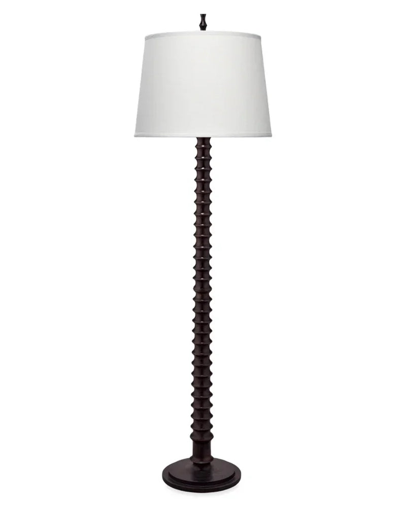 A rich black finish adds drama to the mango wood body and finial of this architecturally appealing floor lamp. Its bold carvings and beveled, circular base contrast strikingly with a scalloped shade in natural linen. Place it next to a couch or an overstuffed chair to instantly modernize any casual interior.