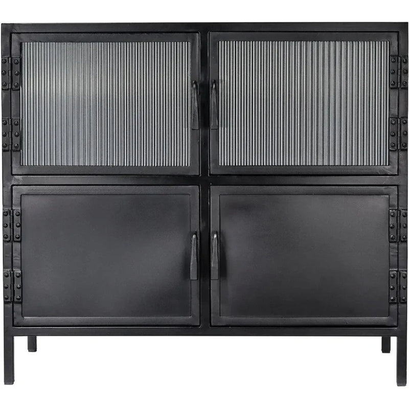 Optimize storage and aesthetic appeal with the Vitrino 4 Door Cabinet. This handcrafted piece, featuring minimal metal and reeded glass, is a perfect addition to any urban or contemporary setting. Use it for keeping serving dishes and media in the dining or media room, or as a stylish storage solution for clothing and blankets in the bedroom. With ample storage space and a sleek design, this modern industrial cupboard fits seamlessly into any room of your home. Crafted with minimal metal finishing and clear, reeded glass, it adds an urban, contemporary touch wherever it is placed. Make the most of your storage and elevate your style with this versatile piece. Utilize it as a storage unit for serving dishes and media in the dining or media room, or store sweaters and blankets in the bedroom.