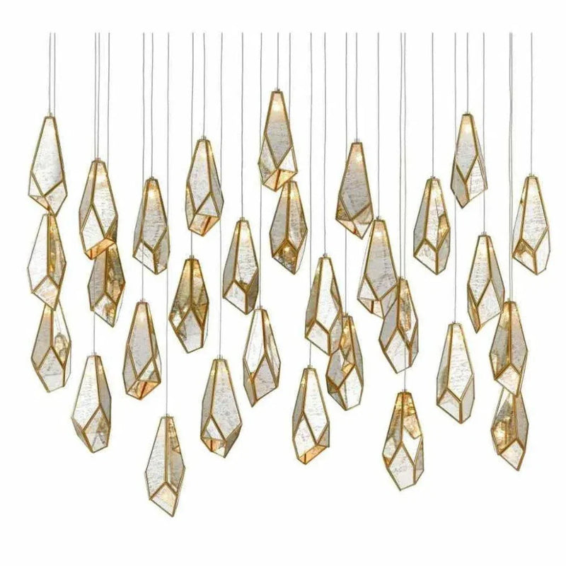 The faceted shades of the Glace 30-Light Multi-Drop Pendant are made of panes of Raj mirror joined with seams of metal in a brass finish. The organic shape of the shades and the fact they hang at differing heights brings this mirrored pendant added personality that will make it a piece of jewelry in a space. The canopy of this piece is luminous in a painted silver finish. This fixture is among Currey & Company's multi-drop pendant collection, which includes multiple configurations.