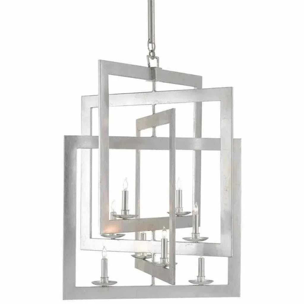 Our Middleton Silver Chandelier has interlocking squares created by wrought-iron bands that are smartly designed. The frame of this eight-light chandelier perfects the illusion of diminishing perspective, its contemporary silver leaf finish making it gleam. Adjustable from 56" to 115" with use of included chain/rod kit/cable. If your space calls for a longer drop, additional chain/rods/cable is available for purchase.
