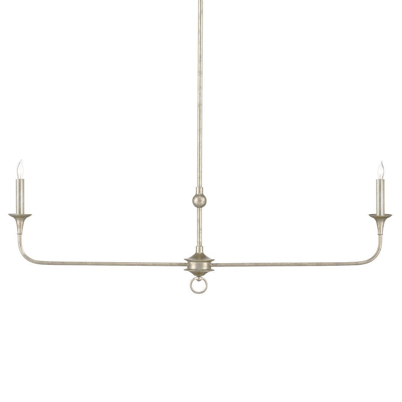 The Nottaway Linear Champagne Chandelier brings a touch of classic elegance to any room. Its slender arms gracefully curve from a small cog at the base of its elongated stem, creating a refined look that stands out. The chandelier's soft champagne silver finish adds a hint of glamour, making it a perfect fit for modern homes. With its minimalist design and antique silver finish, this chandelier is ideal for placement above kitchen islands, bars, or long dining tables. The horizontal bar and two candle-style light fixtures add to its charm, providing a warm, inviting glow to any dining or living area.