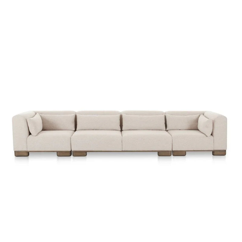 Elevate your living space with the June Modular Sofa Oatmeal, designed for both style and functionality. Its soft beige hue and durable performance fabrics complement any decor, while the oversized oak veneer legs add sophistication. This modular sofa adapts to your space, offering endless layout possibilities with its three modular pieces, making it ideal for both intimate settings and larger gatherings. Comfort is at the forefront of the June Modular Sofa, with plush feather and fiber-filled cushions and supportive lumbar toss pillows. Built with a solid wood and plywood frame, it promises long-lasting durability. Protective leg glides ensure your floors remain pristine, and the versatility of the modular design allows you to rearrange it as you see fit.
