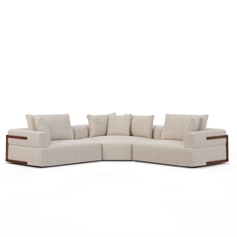 The Warner Performance Fabric Sofa Set, featuring a unique corner sofa design, seamlessly combines modern style with comfort. Wrapped in a semi-rough textured woven fabric, the upholstery in premium Performance Fabric exudes a sophisticated yet approachable look. This sofa's design is enhanced by a luxe walnut wood frame, finished in a medium-dark brown that contrasts elegantly with the soft fabric. The oversized, high pillows paired with a low backrest create a welcoming environment, making it ideal for relaxed gatherings or quiet evenings at home.