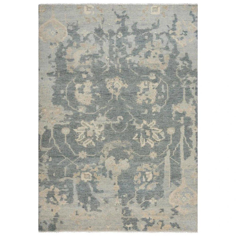 Shapley neutral beige and ivory flowers circle around in a field of blue on this Abby Classical Floral Rug. A short multi-layer fringe finishes the hand-knotted construction of the 100-percent hand-spun New Zealand wool creation. The calming colors will compliment your traditional or Persian style décor in your office or any other room of your home. Now is your chance to own an authentic work of ART. Skilled artisans have been producing fine carpets for centuries completely by hand. As modern technology progresses however, such fine works of art are becoming rarer every day. Starting with the finest of hand spun wool, each row of knotting in a Abby rug is hand tied to the warp strings on a loom with meticulous detail. Several steps of washing by hand adds a rich patina and even more luster to the already soft wool. Once sheared by hand to a plush pile, each piece is then finished with a hand whipped edge surging.