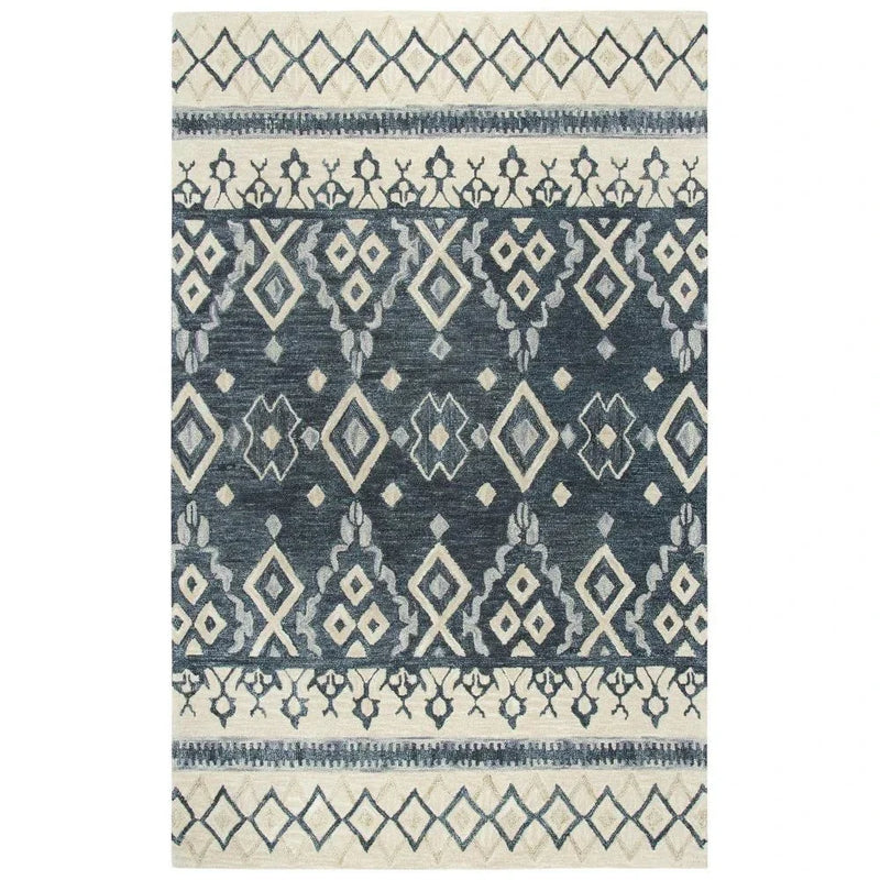 The Lavine Geometric Rug boasts a stunning array of diamonds and delicate floral patterns in its unique design. Handmade from 100% wool, this rug features a single level pile, offering both warmth and durability. The deep indigo blue of the center stripe accentuates the neutral ivory mirrored patterns, making this rug an eye-catching addition to any room in your home. The Lavine rug collection brings texture and dimension to a whole new level. Hand-tufted using premium wool, these abstract and geometric designs make a dramatic statement to any setting. By combining different dying techniques of on trend colors, different yarn thicknesses, high and low, cut piles, and loop pile where it’s called for, the designers of this collection have created high fashion looks at a very affordable price!