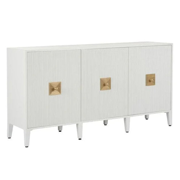 The Burns Credenza offers a blend of style and functionality, making it an excellent addition to any dining space. Its design caters to both formal dining rooms and casual entertaining areas, ensuring that all dining essentials have a place. Multiple shelves inside provide ample storage, allowing you to organize with ease. The reeded wood detailing on the facade adds an intriguing texture, while the aged brass hardware introduces a hint of vintage-inspired glamour. Designed by Elizabeth Wicker, this piece is not only practical but also a statement of style and elegance. Constructed in a rectangular shape, this white cabinet stands on tapered legs, adding a touch of sophistication. The three doors, each adorned with gold square handles, open to reveal the generous storage space within.