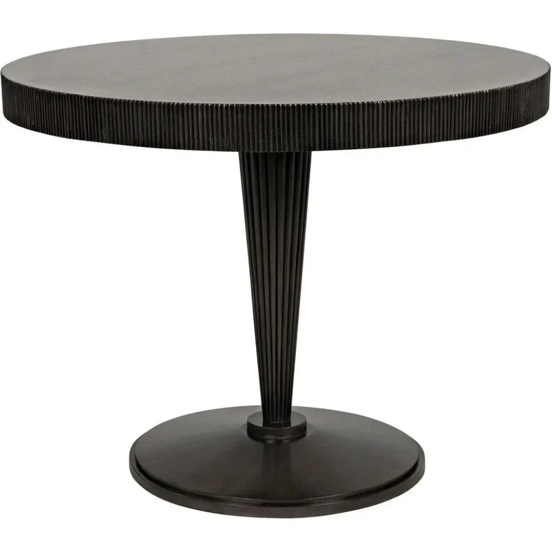 A gorgeous medley of modernity and tradition, this simple yet stylish dining table has been artisan-carved of mahogany and finished in a hand rubbed black. The ribbed base is and table edges add interest. The shape is simple, the details are not. Expertly crafted with a stunning combination of contemporary and classic design elements, the Granada Wood Black Round Dining Table is a must-have addition to any home. Skillfully carved from high-quality mahogany and meticulously finished with a hand-rubbed black stain, this table exudes elegance and sophistication. The ribbed base and intricate table edges provide visual interest, making this table a standout piece in any dining room.