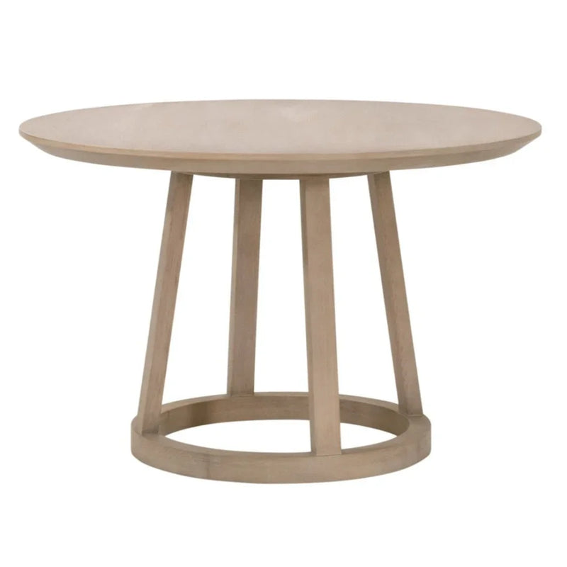 Reeves Dining Table by Essentials For Living serves as the perfect centerpiece for any dining area. Its timeless look with refined materials makes it suitable for both casual meals and formal gatherings. The table features a plank veneer top with a beautiful smoke gray oak finish. It is treated with a reinforced, stain-resistant coating, ensuring durability and easy maintenance. This design not only offers practicality but also adds a touch of elegance to the dining space. Standing on a solid pine wood pedestal base, the table offers sturdy support while creating an open, airy feel beneath the tabletop. This thoughtful design choice not only enhances stability but also adds a touch of elegance to your dining area.