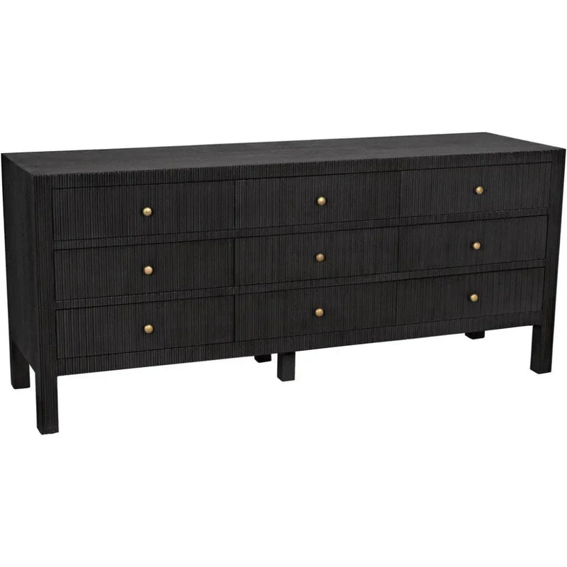 Expertly handcrafted from solid mahogany, the Conrad Wood Dressers with 9 Drawers bring timeless sophistication and practical storage to any room. Each dresser features clean lines, premium veneer surfaces, and brass pulls, offering a refined aesthetic rooted in quality craftsmanship. The Black dresser comes with a pale finish that accentuates the rich grain of the wood, while the White version offers a coastal-inspired white wash that enhances its airy appeal. With nine spacious drawers, both versions provide generous storage without compromising on style, making them ideal for elegant bedroom organization.