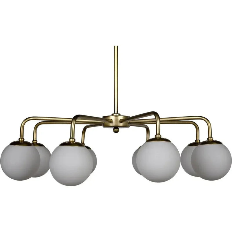 Introduce a touch of retro flair to any room with the Larenta Metal and Glass Chandelier. The antique brass finish and mid-century modern lines bring a perfect balance of charm and innovation. Featuring eight glowing orbs suspended by sleek lines, experience a retro-futurist take on a classic chandelier. Mid-century modern lines in antique brass finished metal suspend eight glowing orbs in this retro-futurist take on a classic chandelier. Ideal for adding a touch of retro flair to any room, the Larenta Metal and Glass Chandelier with Antique Brass boasts eight glowing orbs suspended by sleek mid-century modern lines. Experience the perfect balance of antique charm and modern innovation.
