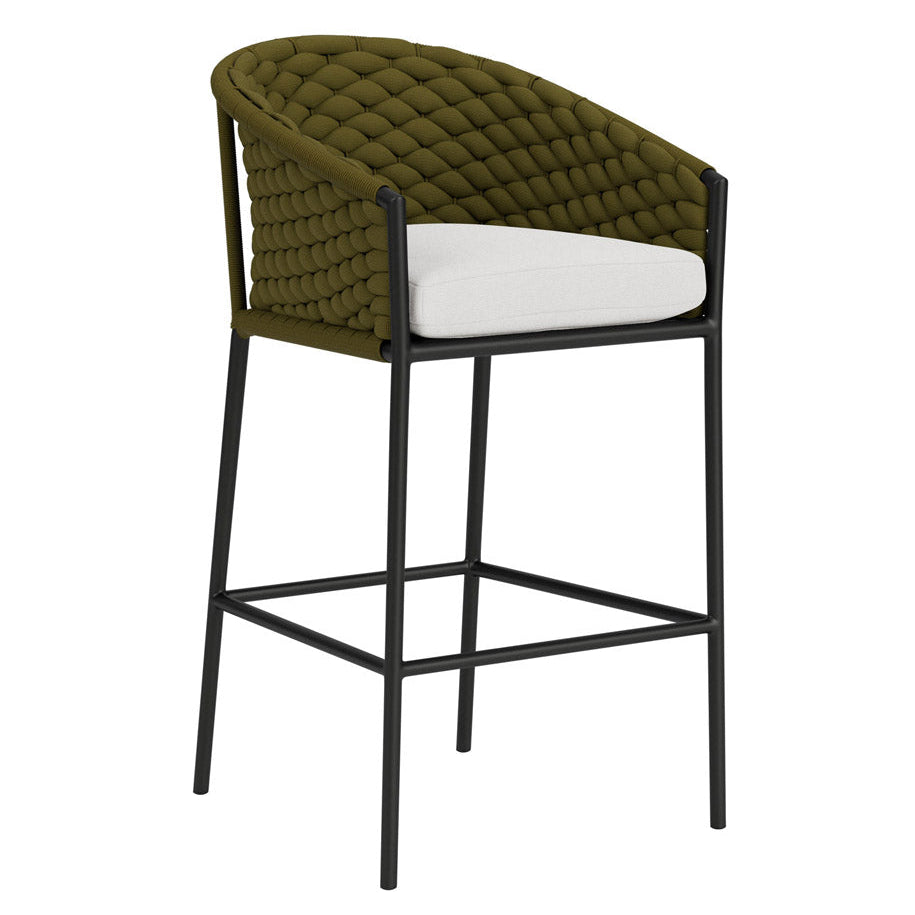 The Escape Bar Stool features a striking spruce green knitted fabric woven in a honeycomb pattern, adding a touch of nature-inspired beauty to your outdoor oasis. The all-aluminum frame, with a matte charcoal finish, offers exceptional strength with a touch of simple elegance. Seat cushions are made with a core of foam for structure and longevity, wrapped with polyester layered fill for plush comfort and completely encased in a moisture resistant fabric for low maintenance in outdoor settings. Lloyd Flanders furniture is manufactured overseas, with all cushioning made in the USA. Its aluminium frames are designed to resist expansion and contraction during weather changes, ensuring years of low-maintenance outdoor use.