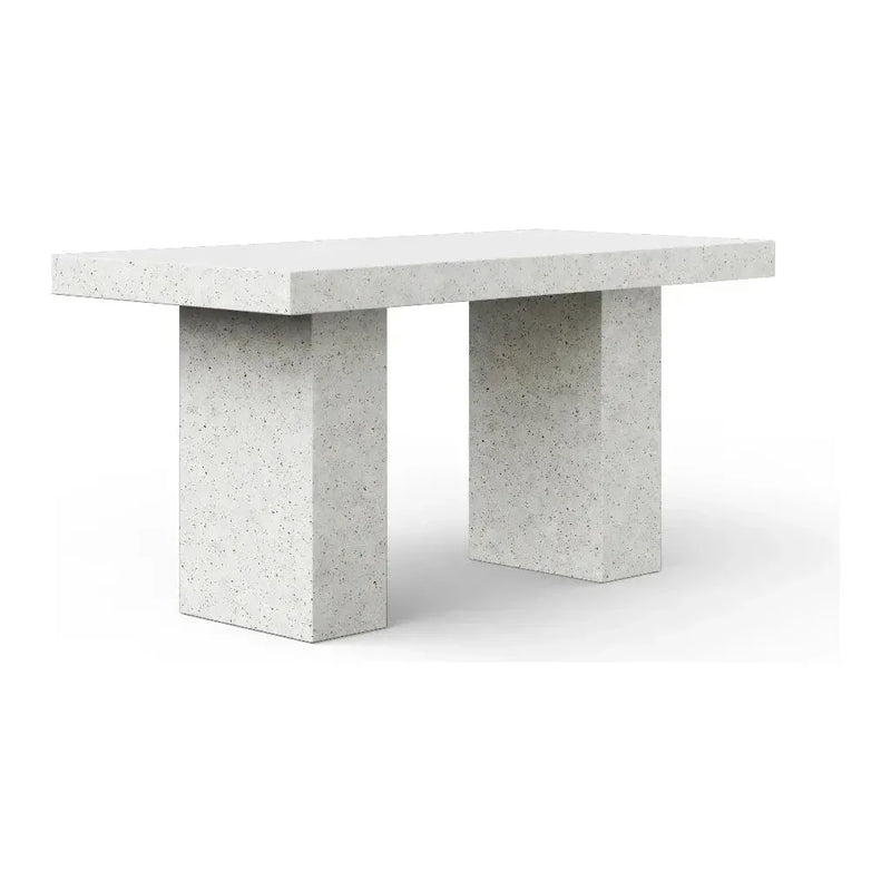 Handcrafted by skilled artisans in Vietnam, the Elcor Counter Height Dining Table is a stunning addition to any space, showcasing a unique combination of natural materials and expert craftsmanship. Its rectangular top, supported by two robust pedestal legs, highlights a distinctive ivory terrazzo finish. Each table features a unique patina with natural markings and varied tones, bringing a one-of-a-kind charm to your dining area. Constructed entirely from durable fiber-reinforced concrete, this piece merges a refined aesthetic with an industrial edge, making it both stylish and functional.