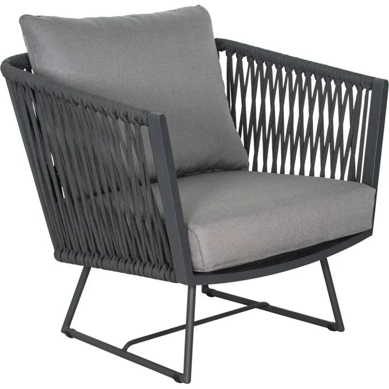 - Dark Gray powder-coated aluminum frame, Dark Pebble polypropylene rope weave, nylon glides; regular foam seat cushion with raincoat, crushed Quick Dry foam back cushion, Texsilk Slate Gray spun polyester zippered covers.