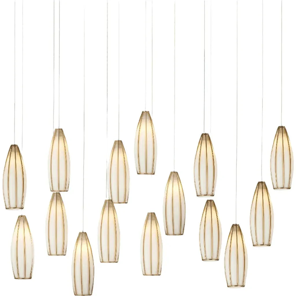 The Parish 15-Light Rectangular Multi-Drop Pendant has slender tear-drop-shaped shades made of white glass poured into a metal cage in an antique brass finish when it was still molten. A remarkable result of this process is that it creates tiny pinholes of light that escape through micro-bubbles that form in the glass, making the Parish effervesce like an upside-down goblet of champagne.