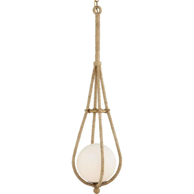 Unwind in the elegance of the Passageway Rope Pendant By Currey Co. Designed by Clarence Mallari, this divine ceiling light showcases a rope-wrapped design in a dorado gold finish. The frosted glass globe radiates a cozy glow, setting a delightful ambiance. Its strategically placed arms allow for simple bulb replacements, making it ideal for maritime settings. Elevate your decor with this exquisitely crafted pendant. Passageway Rope Pendant By Currey Co.
