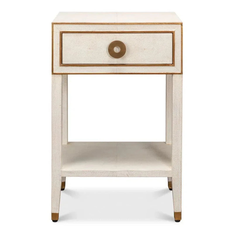 Awaken to the beauty of craftsmanship with the Gabriella Shagreen Nightstand in Osprey White. Made with precision and passion, its iron base and Leather finish epitomize luxury. The Osprey White shade is a blend of modern style and timeless grace, perfect for contemporary bedrooms. The brass hardware adds a touch of glint, making every morning a bright one. With its elegant design and meticulous construction, the Gabriella Shagreen Nightstand in Osprey White is a luxurious addition to any bedroom.