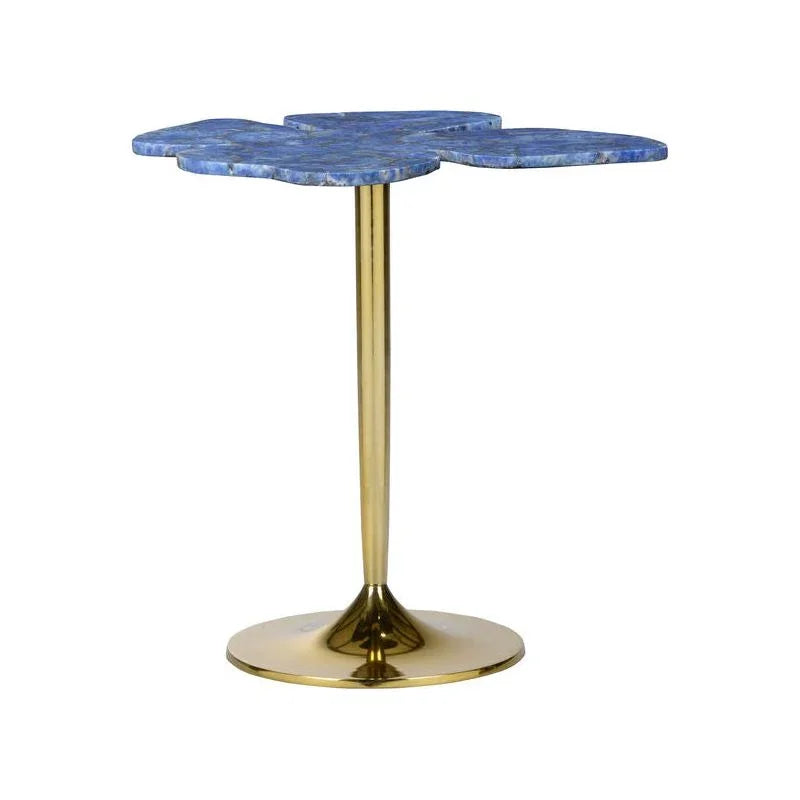 Adding a touch of elegance to any room, this side table offers a blend of modern design and natural beauty. The eye-catching blue quartz top and hand cut petrified wood is hand-cut, ensuring each piece has its own unique texture and appearance. A gold and silver-finished metal base provides a striking contrast, enhancing the table's sophisticated look. This piece is part of the Chelsea House Misc collection, known for its high-quality craftsmanship and timeless designs. The table's flowing, organic feel makes it a versatile addition to various interior styles, from contemporary to classic. Its vibrant blue and black top serves as a statement piece, while the gold-silver stem and round base add warmth and luxury.
