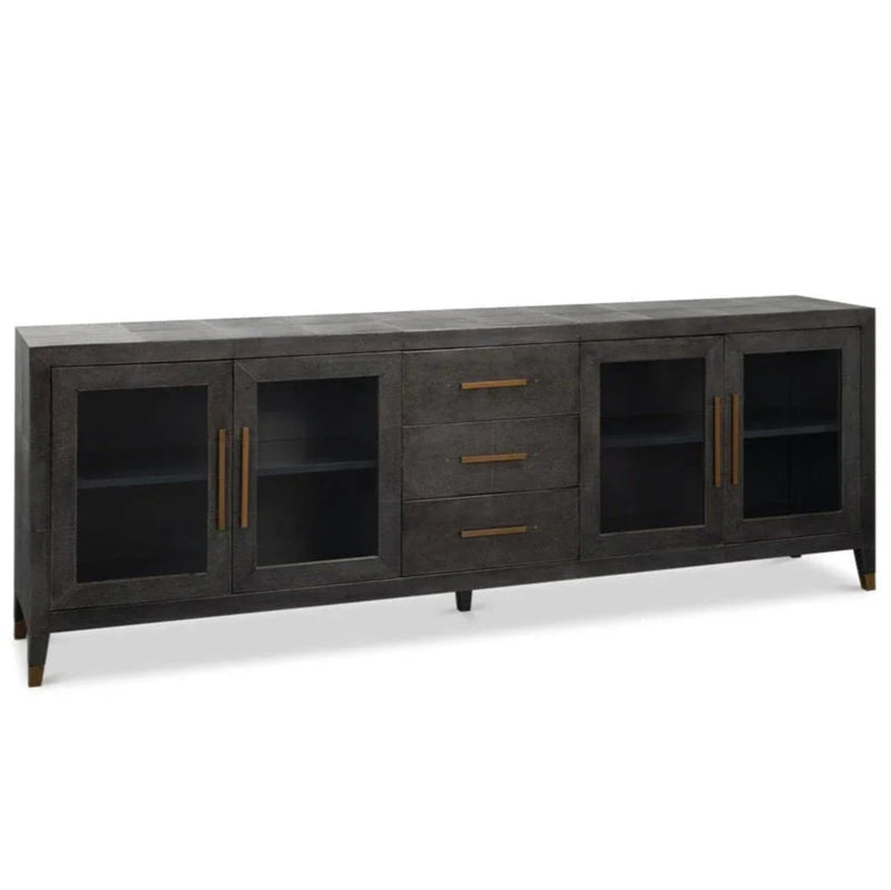 The Desmond Sideboard Shagreen Antique Grey With Brass Charm is a blend of style and function that adds sophistication to any home. Wrapped in antique grey blackstone shagreen leather, this piece exudes a refined elegance. It features a transitional design that fits seamlessly into a variety of decor styles. The aged brass pulls and capped legs enhance its visual appeal, making it a standout addition to your living space.