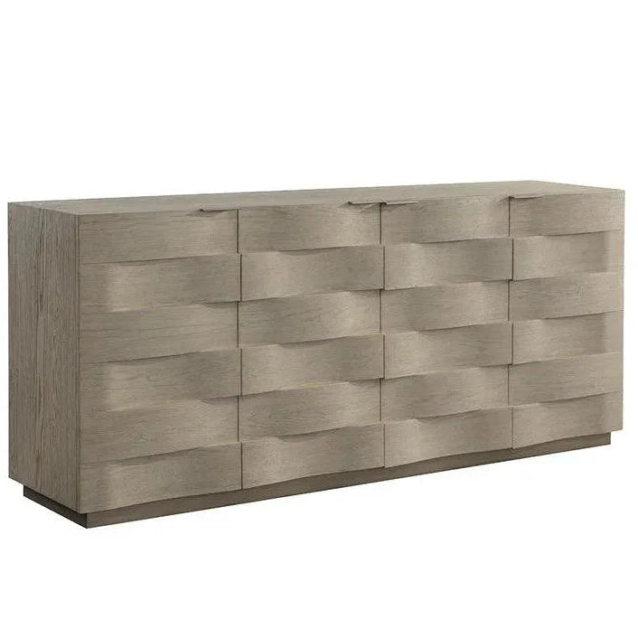 The Hoyos Sideboard is a perfect blend of style and function. With its mismatched curved panels on the front doors, it stands out in any dining room. Crafted from poplar wood and oak veneer, this sideboard features warm brass aluminum handles that add a touch of elegance. The light wash finish of the wood gives it a contemporary look, making it a great addition to modern homes. Each piece is unique due to the natural variations in the wood, including texture, color, and grain.