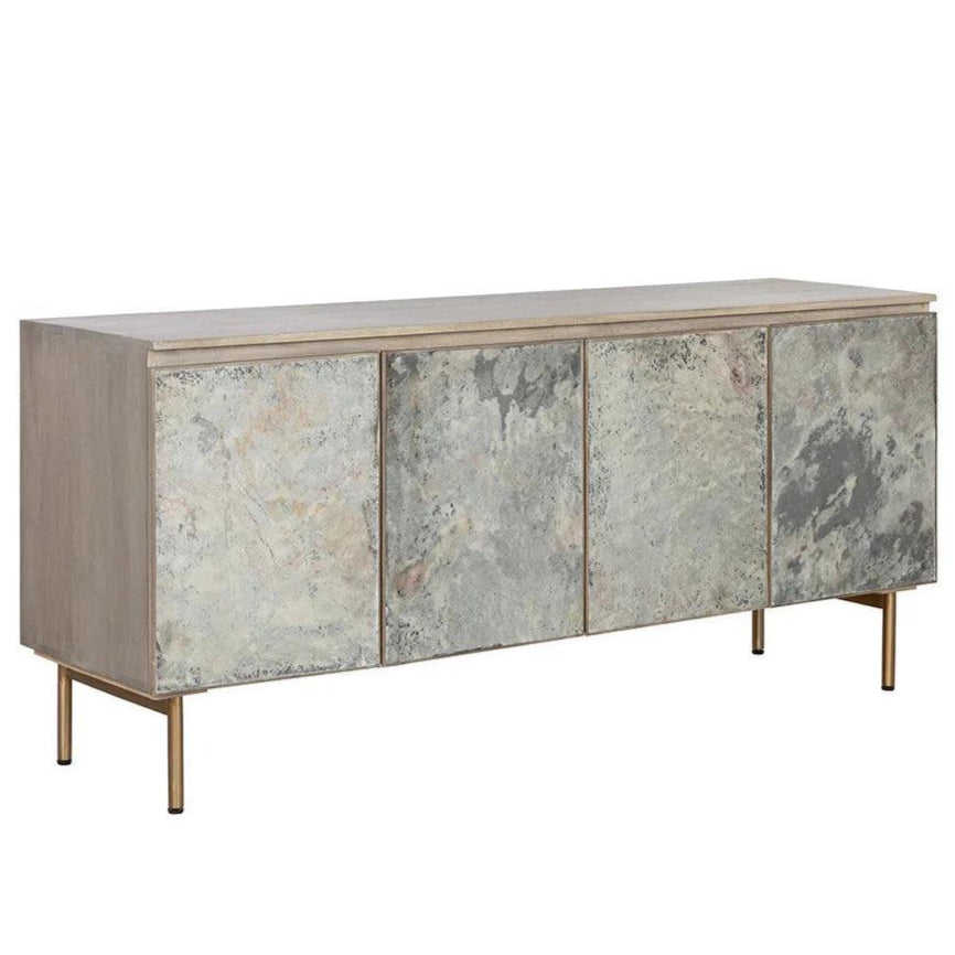 Rich with texture, this unique sideboard illustrates the beauty of mixed materials coming together in harmony. It features a grey solid mango wood frame with slate veneer on the door fronts. Completed with stainless steel legs in a brass finish, this sideboard is made in India with refined craftsmanship, brought to life by skilled local artisans. By nature, these materials develop unique imperfections such as fissures, markings, and color variations, making each piece one-of-a-kind.