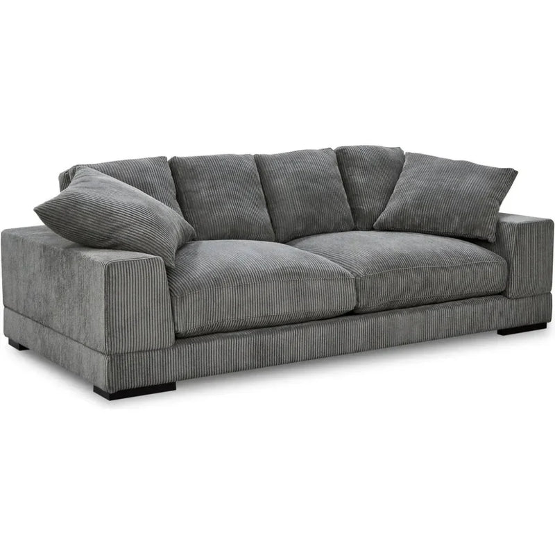 The Plunge sofa offers the perfect blend of style and comfort. Its sleek design, made with 100% polyester and a solid eucalyptus frame, effortlessly fits any space. The reversible foam-filled cushions provide long-lasting softness, while the protective leg glides ensure durability. Relax and unwind on this spacious and elegant sofa for years to come. A fusion of comfort and elegance with clean lines and plush cushions, the Plunge sofa is masterfully crafted to maximize space and provide unparalleled relaxation. Experience the perfect balance of style and relaxation. Featuring improved channeling and filling distribution, the Plunge sofa offers lasting comfort and adapts seamlessly to any living space. Enjoy years of plush cushioning and soft landings with this expertly crafted piece.