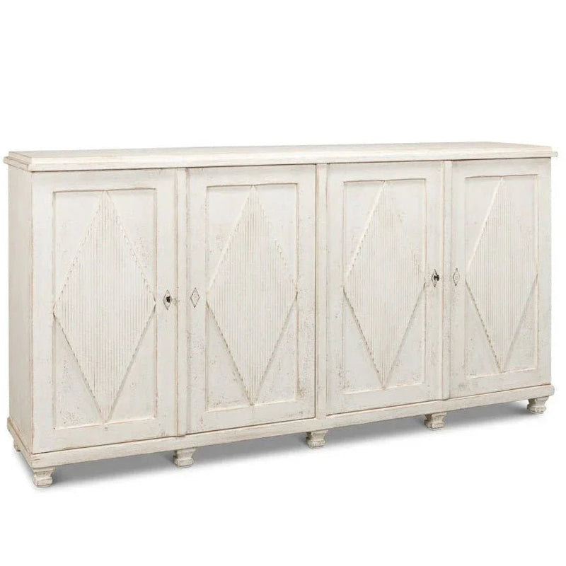 Elevate your home with the Beecher Whitewash Wooden Sideboard, a perfect fusion of rustic charm and functional design. Made from reclaimed pine, this durable piece features a distressed white finish that evokes a vintage coastal vibe. Its distinctive diamond pattern on four doors, complemented by ribbed textures and metallic keyhole details, adds refined artistry. Inside, four fixed shelves provide generous storage for dinnerware, linens, or essentials. With a stable rectangular form and short legs, this sideboard offers both classic style and practicality, making it an elegant and versatile addition to any room.