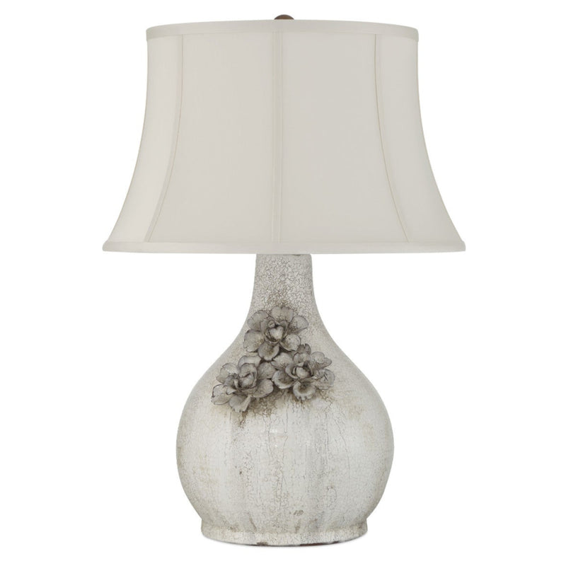 The Attar White Table Lamp adds a touch of timeless elegance to any room. Made from ceramic, it features a unique crackled glaze that gives it a charming, aged look. This textured finish stands out on the trio of hand-formed flowers, each adding dimension and a touch of artisan craftsmanship. The soft-backed, bell-shaped shade completes the vintage-inspired design, offering a traditional silhouette that fits well in both modern and classic interiors. Its white color ensures it blends seamlessly with various décor styles, making it a versatile piece for any home.