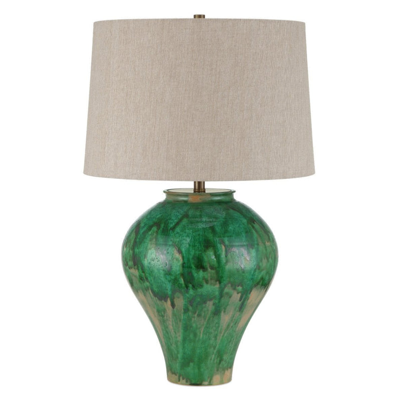 The Blarney Green Table Lamp is a true work of art, crafted meticulously from hand-thrown porcelain. Its unique design is enhanced by a painterly green glaze that creates an organic and free-flowing pattern. This glaze technique results in natural drips and gradients, giving each lamp its own distinct look. No two lamps are exactly alike, making each piece a unique addition to your home decor. This individuality highlights the artisanal process behind its creation, making it a perfect choice for those who appreciate craftsmanship.