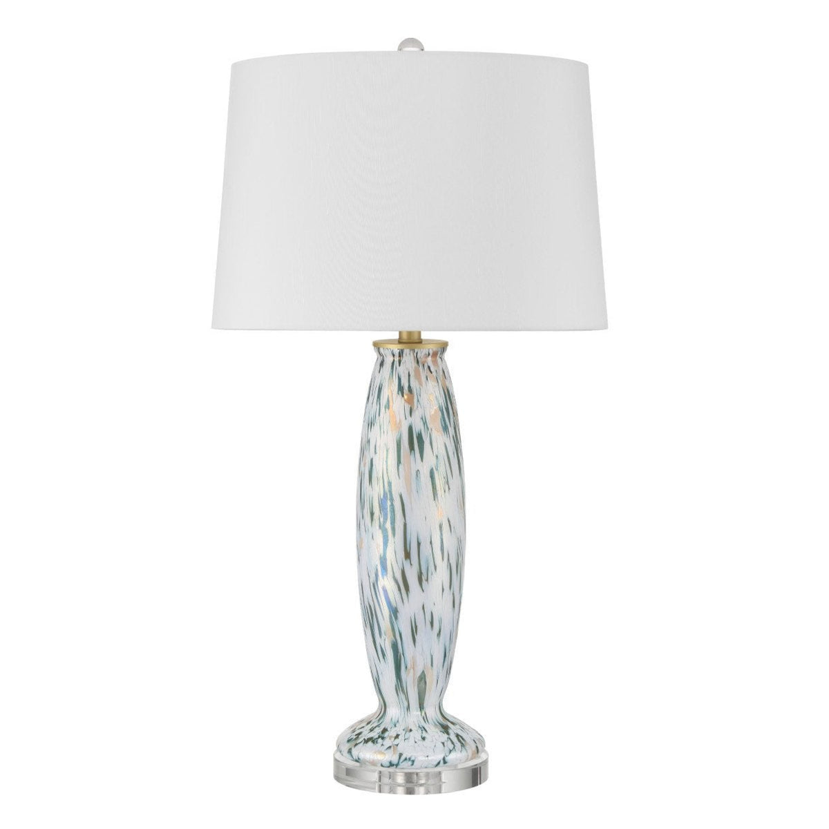 Standing tall with a height of 31.75 inches and a diameter of 17 inches, this lamp makes a statement in any room. The multi-colored glass body is set off by a pale shade, creating a warm and inviting glow when lit. The oval base adds stability and style, while the silver finish complements the lamp's overall design. Perfect for adding a decorative touch to side tables, desks, or nightstands, the Motte Table Lamp is both functional and beautiful.