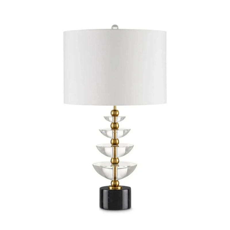 Ian Thornton's masterful design of the Waterfall Table Lamp features an articulated stem fitted with optic crystal cup-like discs that radiate an elegant glow when the light is switched on. Taking inspiration from the serene flow of a fountain, this fixture exudes modern sophistication. The sleek black marble base perfectly complements the clear shapes, which are accentuated by brass finish metal globes. Topping off the luxurious look is the off-white shantung shade, making this lamp a true masterpiece.