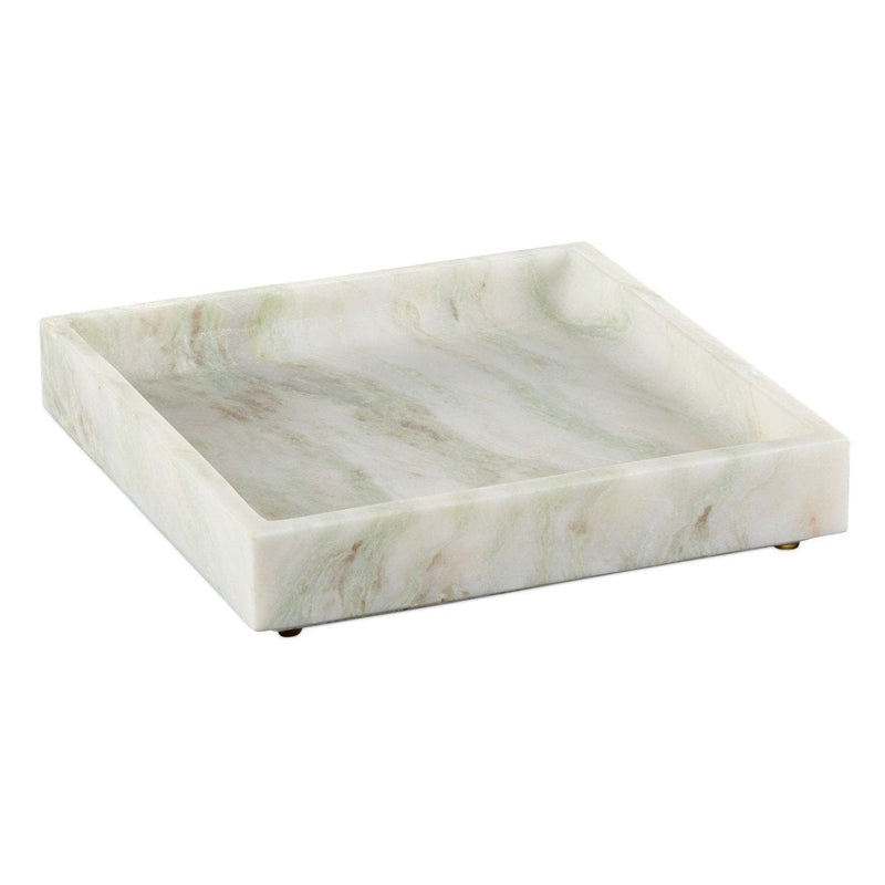 The tray's design is not just about aesthetics; it also offers practical benefits. The inclusion of bumpers ensures protection for your furniture, preventing scratches or marks. With its shallow depth, the tray is perfect for organizing and displaying items like candles, small plants, or decorative objects. Its white color with light green swirls effortlessly complements various interior styles, adding a chic touch to any room.