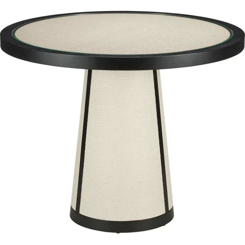 The pedestal of the Deanna Raffia Entry Table has three panels of woven raffia trimmed in Okoume wood veneers in a black finish that flow up to the circular top, also clad in raffia surrounded by a black wood detail. The combination of black and beige bring this entry table a tailored feel that fits within a wide spectrum of design styles, especially a room that exudes Hollywood glamour. The subtle texture of the raffia is a special aspect of this design, as is the fact the table is fitted with an inset glass top to protect the natural fibers.