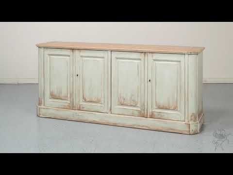 Elevate your space with the rustic charm and sustainable design of the 4 Door Sideboard Sage Buffet. This country-inspired piece features a natural old pine top and sage base, perfectly complementing the 2 removable shelves for versatile storage options. Add a pop of fresh color and generous storage to your dining room.