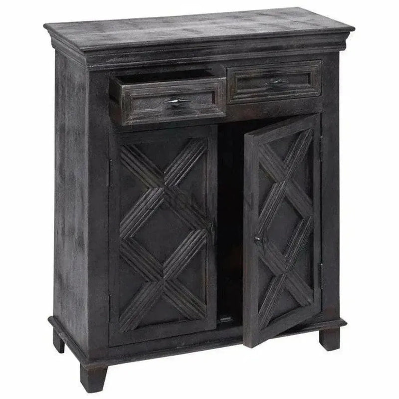 Elevate your living space with our 40" Black Rustic X Farmhouse Wood Cabinet With Drawers. Crafted from water-resistant mango timber and finished with a slightly distressed black lacquer, this sideboard features channeled "X" molding and powder-coated metal hardware. The spacious interior and two top drawers provide ample storage, while adding an elegant touch to any room. Suitable for entryways, hallways, bedrooms, or family rooms, this cabinet is both functional and a work of art with its stunning design. With its unique "X" molding and powder-coated hardware, this striking black sideboard is a dramatic accent piece that adds style and convenience to any space.