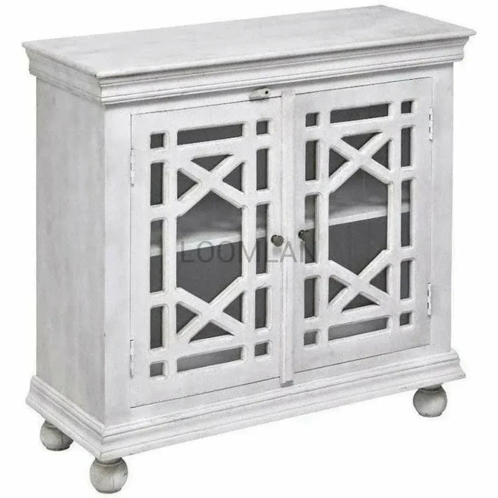 Lidia 40" Distressed White Solid Wood Glass Trellis Doors Accent Cabinet Features: