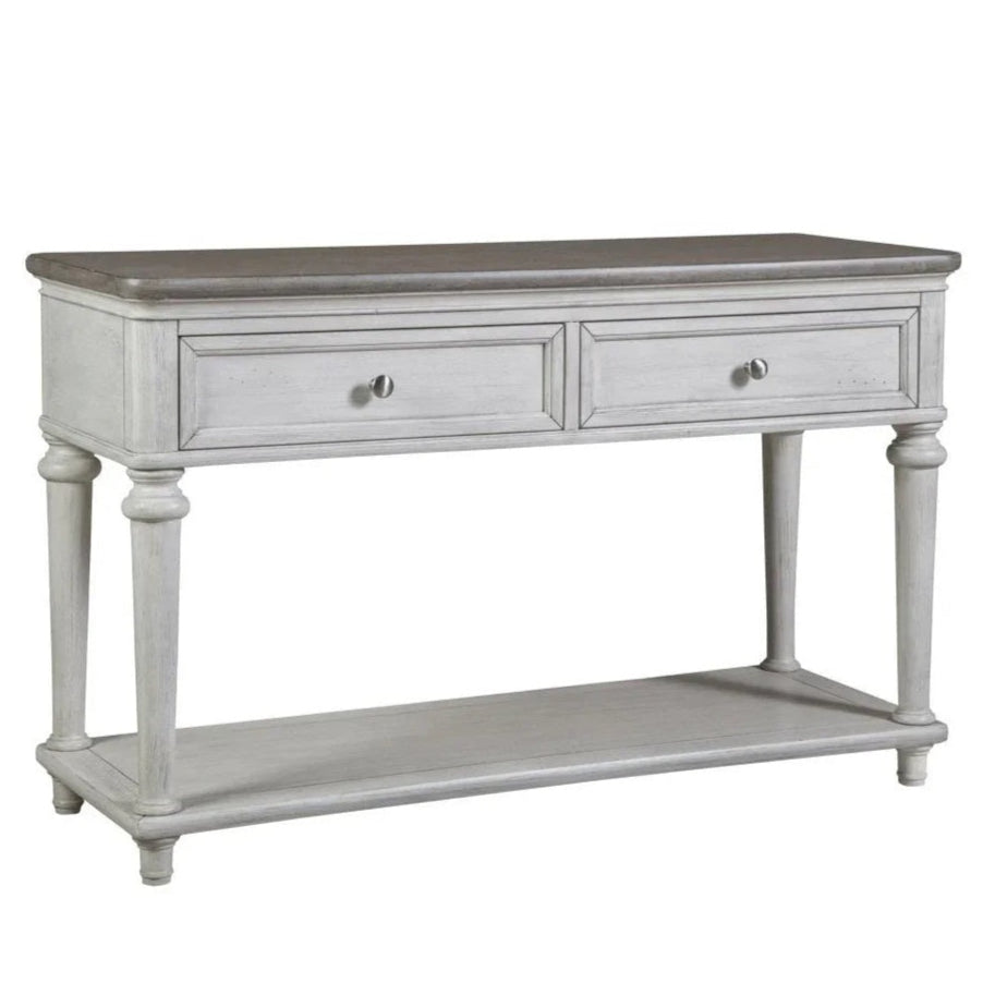 Introducing the Panama Jack Sonoma sofa table - the perfect blend of classic cottage style and modern elegance. Featuring a two-tone finish of wire-brushed grey and antique weathered white, this table adds a touch of sophistication to any room. Its soft rounded corners, molded drawers, and tapered turned feet showcase a timeless yet contemporary look, making it a must-have for any home.