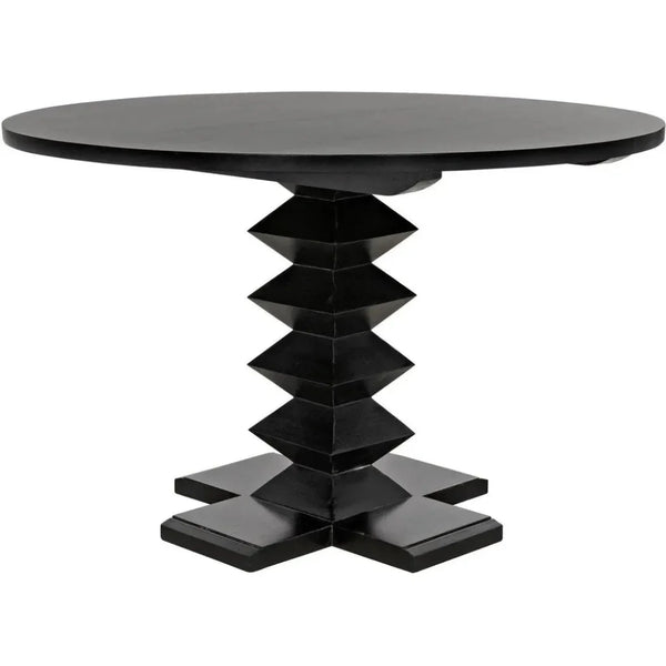 Elevate your dining experience with our 48" Zig-Zag Wood Black Round Dining Table. Handcrafted from pale or hand rubbed black mahogany, the table legs showcase a refined and unique Zig Zag design, expertly executed by our skilled artisans. A true work of art, this table exemplifies both beauty and scientific skill. Handcrafted of pale or hand rubbed black mahogany, this dining collection is defined by the refinement of its table legs. The distinct effect is created by our artisans who showcase the science of beauty by utilizing unique geometric shapes to achieve the unique Zig Zag look.