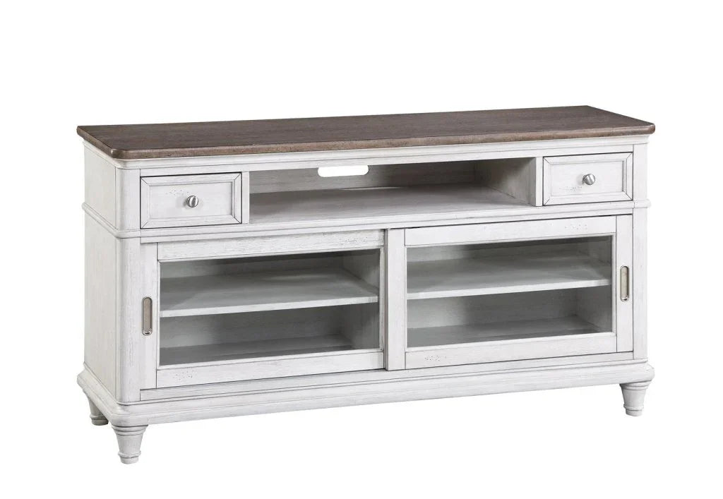 Elevate your living room with the Panama Jack Sonoma entertainment console. Featuring a wire-brushed grey and antique weathered white two-tone finish, this console adds a touch of sophistication to any space. Its cottage/bungalow design includes soft rounded corners, molded doors and drawers, and tapered turned feet, making it perfect for any environment.