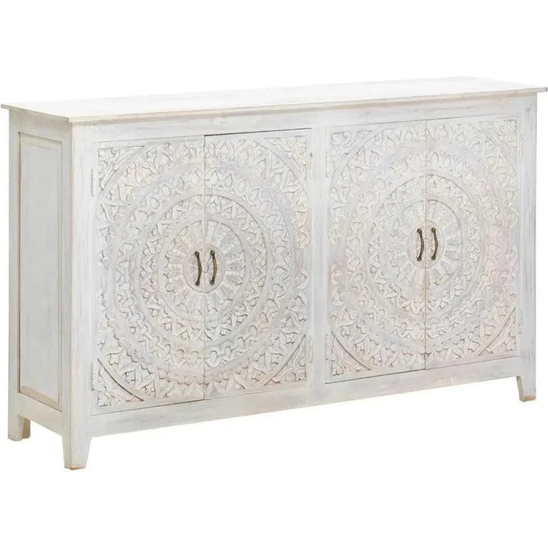 Indulge in luxury with our 64" White Carved Feyloren 4 Door Sideboard. This exquisite piece, hand-carved from tropical hardwood and a distinctive circular pattern. Its flora finish adds a refreshing touch to any space, while the spacious interior and rare extra-long size make it a practical and visually stunning focal point. A timeless work of art, this elegant boasts meticulous carvings and routed details, with a specious shelved interior behind four doors. The intricacy of its carvings creates a captivating circular pattern, highlighted by woven lotus flowers. At 64 inches long, this sideboard is perfect for larger spaces and exudes a sophisticated and exclusive aura.