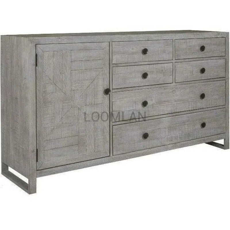 Experience the ultimate in luxury with LOOMLAN's exclusive Serenity Dresser. Each piece is painstakingly crafted from reclaimed wooden pallets, showcasing a distinct story with visible imperfections. The sublime gray finish, highlighted by a white glaze, brings a sense of opulence to any room. This dresser features six spacious drawers and a cabinet for optimal storage. Constructed with distressed solid pine from reclaimed wooden pallets, LOOMLAN masterfully blends quality and sustainability. The Serenity Dresser boasts six drawers and one cabinet, providing ample space for your possessions.