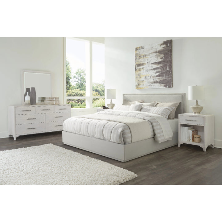 The Abaco Upholstered Bed 4-Piece Set combines contemporary elegance with functional design, featuring a heavy wire-brushed oak veneer in a crisp white finish. The bed’s low-profile frame is complemented by a wide flange headboard upholstered in durable, textured performance fabric, offering both comfort and style. Available in Queen and King sizes, it serves as the sophisticated focal point of the set. Mattress and box spring are sold separately. The set includes a bed, seven-drawer dresser, mirror, and nightstands—all constructed with English dovetail joints and full-extension metal side-mounted glides. Drawers feature custom silver hardware for smooth operation and refined aesthetics. Each nightstand offers a drawer, open shelf, and built-in USB charging ports to keep your devices powered and essentials organised. This set expertly balances elegance, storage, and technology to enhance any bedroom.