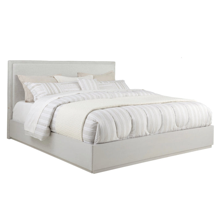 The Abaco Upholstered Bed combines contemporary style with exceptional comfort, featuring a heavy wire-brushed oak veneer in a crisp white finish. Its softly rounded edges, low-profile siderails, and footboard create a streamlined platform appearance, while the wide flange headboard, upholstered in durable Biot Platinum textured performance fabric, adds depth and a refined tactile experience. Available in Queen and King sizes, this bed’s minimalist design complements a variety of interiors and bedding styles. Though it presents a platform look, a box spring and mattress (sold separately) are required for proper support. The Abaco Upholstered Bed offers a sophisticated blend of function and elegance, ideal for modern bedroom settings.