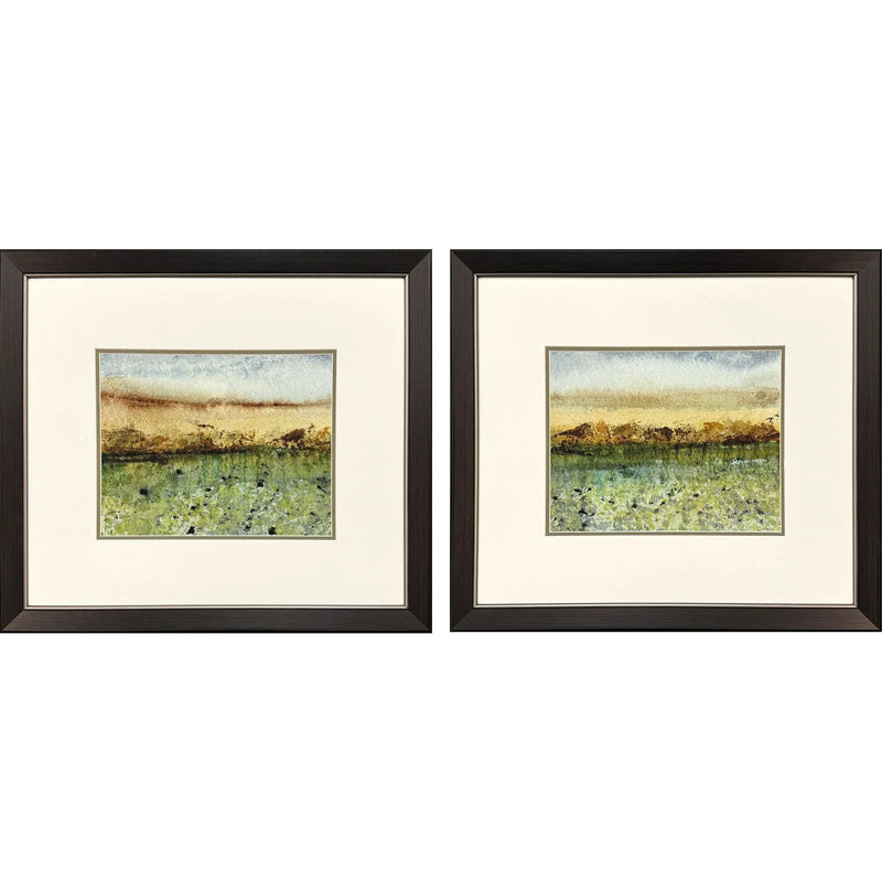 The Abstract Vast Field S/2 Tranquil Hand Assembled Art brings a soothing touch to any room. This set of two framed abstract paintings captures the serene beauty of a distant horizon. With dominant shades of green, beige, and blue, these artworks create an almost ethereal atmosphere. Their landscape orientation is perfect for adding a sense of depth and tranquility to your space, making them a fine addition to any home or office.